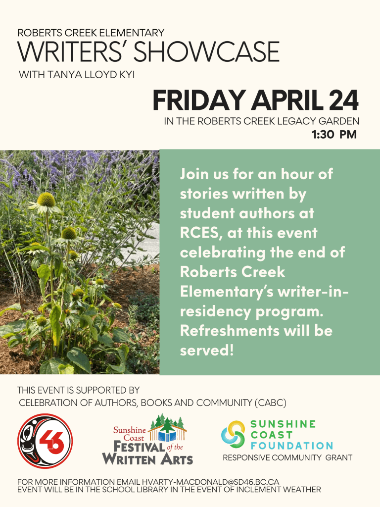The Roberts Creek Elementary Writer-in-Residence program will culminate with a celebratory public event featuring Kyi and some of the student participants reading from their work. The event will take place on Friday, April 24 at 1:30 pm at the Roberts Creek Legacy Garden (or, in the case of inclement weather, the Roberts Creek Elementary School Library).